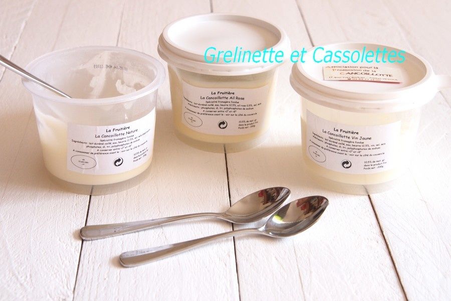 Nom : Cancoillotte. Mais en Franche Comté on l'appelle aussi malicieusement "la colle", à cause de sa consistance... Son nom vient du "caillot", le lait caillé, purgé de son petit lait.
