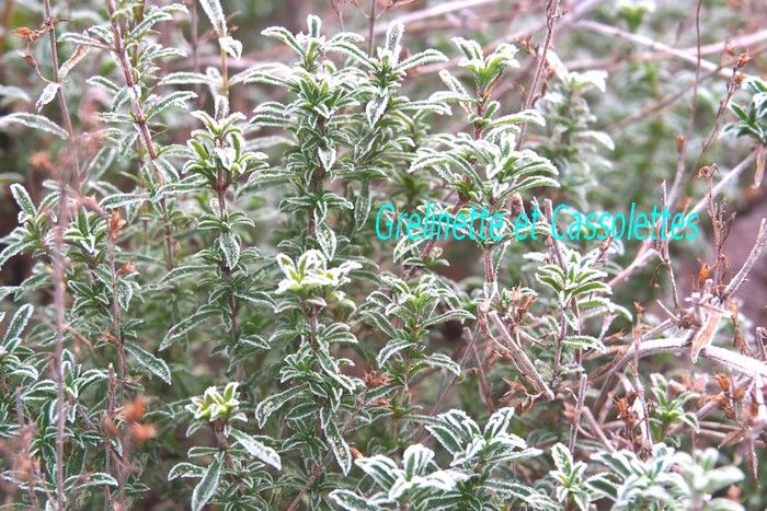 Les aromatiques, comme ici la sarriette, reprendront leur jolies couleurs vertes un peu plus tard dans la journée...